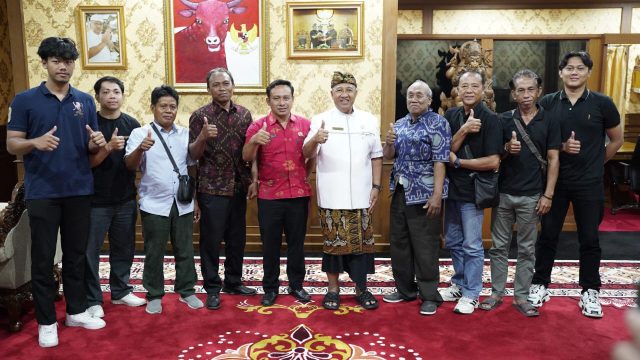 KECAK MEKOTEK – Ketua DPRD Badung Putu Parwata menerima pengurus Banjar Adat Pengayehan Desa Adat Munggu bersama para yowananya, Selasa (21/5/2024). Mereka berencana membuat ikon desa berupa Kecak Mekotek.