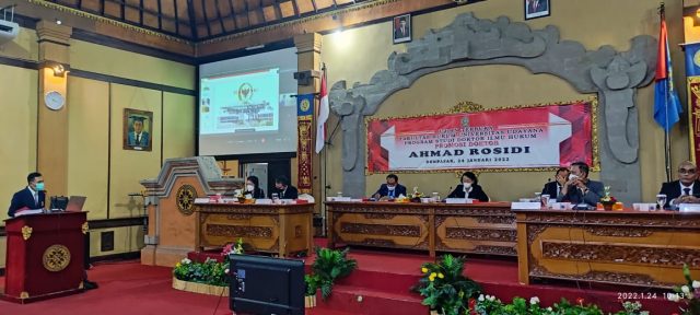 DOKTOR – Ujian terbuka Ahmad Rosidi untuk meraih gelar doktor di Fakultas Hukum Unud, Senin (24/1/2022).