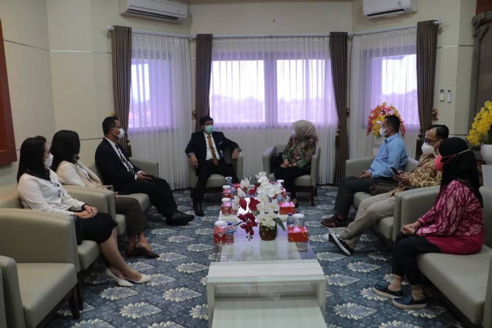 Rektor Universitas Udayana Prof. Dr. Ir. I Nyoman Gde Antara, M.Eng.,IPU yang didampingi Wakil Rektor Bidang Perencanaan, Kerjasama dan Informasi Prof. Dr. dr. I Putu Gede Adiatmika, M.Kes beserta Ketua Inkubator Bisnis Unud menerima kunjungan Deputi Bidang Kewirausahaan Kementerian Koperasi dan UKM Siti Azizah beserta tim bertempat di Ruang Transit Rektor Gedung Rektorat Kampus Bukit Jimbaran, Senin (31/1/2022).
