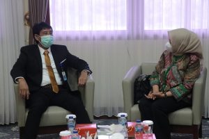 TERIMA DEPUTI – Rektor Unud Prof. Nyoman Gde Antara menerima kunjungan Deputi Bidang Kewirausahaan Kementerian Koperasi dan UKM Siti Azizah di Ruang Transit Rektor Gedung Rektorat Kampus Bukit Jimbaran, Senin (31/1/2022).