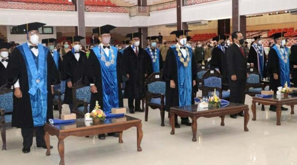 Pengukuhan guru besar tetap berlangsung secara hybrid (kombinasi daring-luring) dari Gedung Auditorium Widya Sabha Kampus Jimbaran, Sabtu (29/1). Terlihat dihadiri pula oleh Wakil Gubernur Cok Ace. Dalam acara pengukuhan guru besar tetap Unud ini seyogyanya mengukuhkan sebanyak enam orang guru besar. Namun salah satu di antaranya telah berpulang, yakni Prof. Dr. Ir. Sri Mulyani, MP dari Fakultas Teknologi Pertanian sehingga yang hadir langsung dalam pengukuhan lima orang.