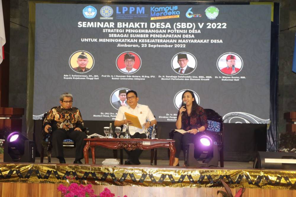 Universitas Udayana melalui Lembaga Penelitian dan Pengabdian Kepada Masyarakat (LPPM) menggelar Seminar Bhakti Desa (SBD) V Tahun 2022 serangkaian dengan perayaan Dies Natalis ke-60 dengan tema “Strategi Pengembangan Potensi  Desa sebagai Sumber Pendapatan Desa Untuk Meningkatkan Kesejahteraan Masyarakat Desa”. SBD dihadiri oleh para kepala desa, lurah dan bendesa adat se-Bali serta undangan lainnya yang berlangsung secara luring bertempat di Gedung Auditorium Widya Sabha Kampus Jimbaran, Jumat (23/9/2022).