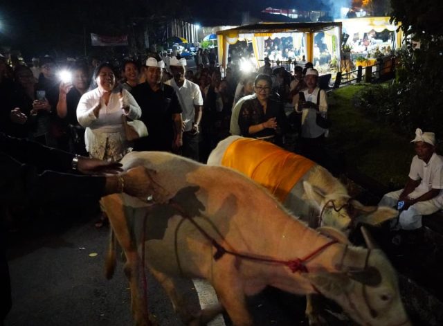 Sebagai bentuk dukungan, Wakil Gubernur Bali menyerahkan punia Rp25 juta, sementara Ibu Putri Suastini Koster menyumbangkan tiga ekor kerbau guna mendukung kelancaran pelaksanaan upacara.