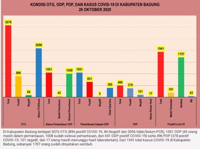 Pada Senin (26/10/2020), ada penambahan 22 kasus positif sehingga total kasus positif covid-19 di Badung kini menjadi 1.941 orang (378 PDP, 651 ODP, 896 OTG, 16 PMI). Hal ini diungkapkan Koordinator Kehumasan Gugus Tugas Percepatan Penanganan Covid-19 Badung, GN Jaya Saputra.