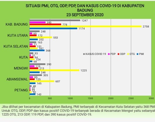 Pada Rabu (23/9/2020), ada penambahan 11 kasus positif sehingga total kasus positif covid-19 di Badung kini menjadi 1.247 orang (275 PDP, 378 ODP, 578 OTG, 16 PMI). Hal ini diungkapkan Koordinator Kehumasan Gugus Tugas Percepatan Penanganan Covid-19 Badung GN Jaya Saputra.