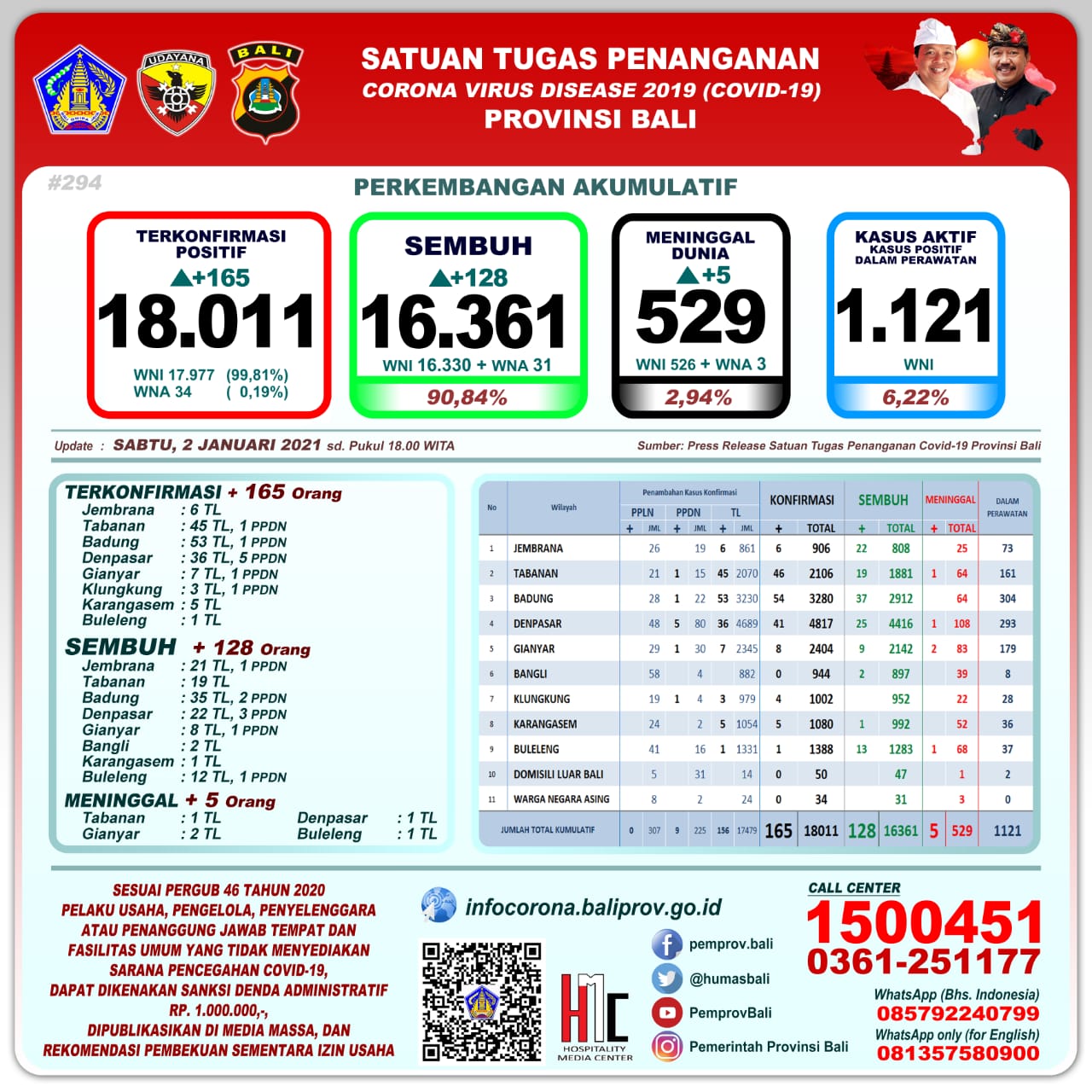 Perkembangan pandemi covid-19 di Provinsi Bali per Sabtu (2/1/2020), hari ini mencatat pertambahan kasus terkonfirmasi 165 orang (156 orang melalui transmisi lokal dan 9 PPDN), sembuh 128 orang, dan 5 orang meninggal dunia.