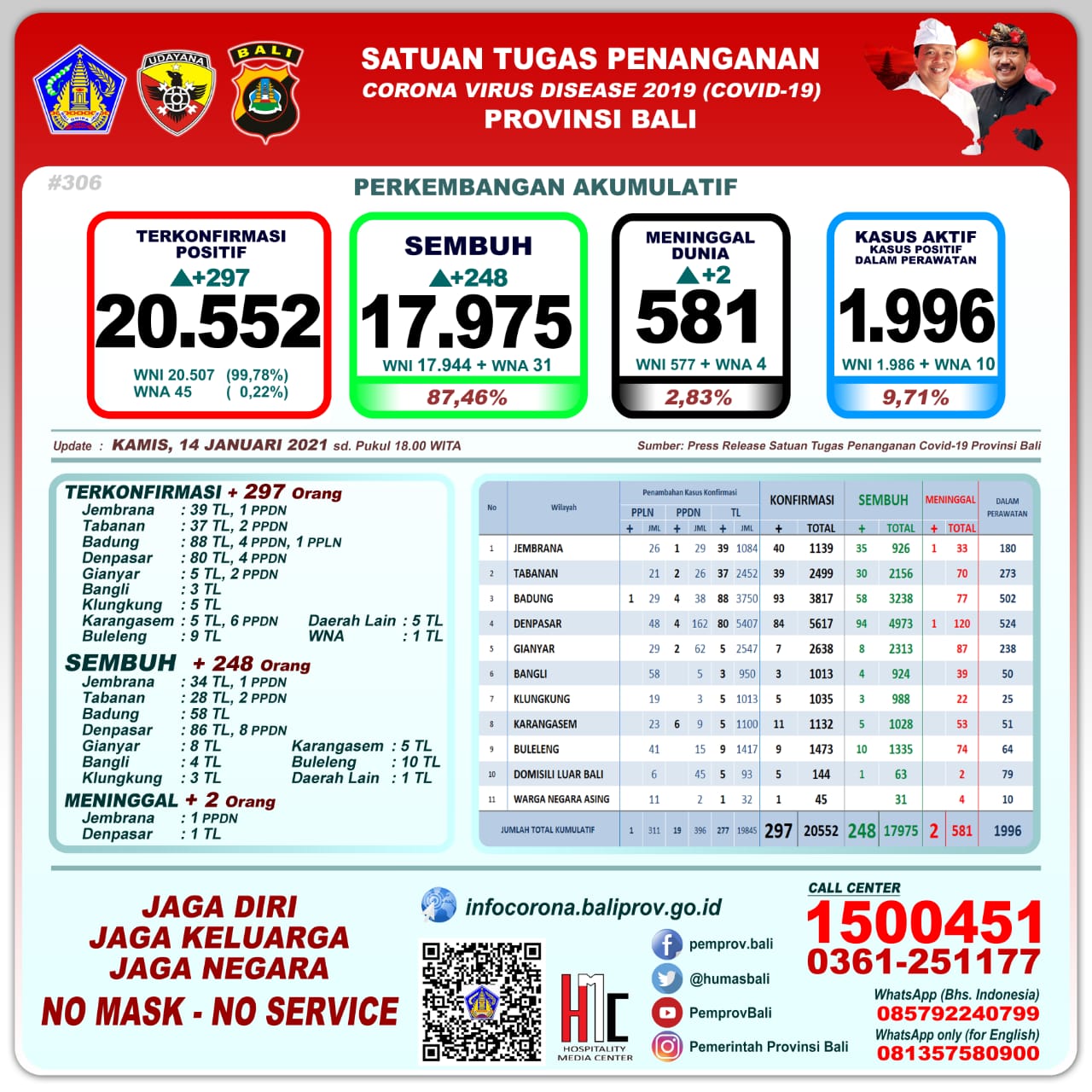 Perkembangan pandemi covid-19 di Provinsi Bali per Kamis (14/1/2021), hari ini mencatat pertambahan kasus terkonfirmasi 297 orang (277 orang melalui transmisi lokal, 19 PPDN dan 1 PPLN), sembuh 248 orang, dan 2 orang meninggal dunia.