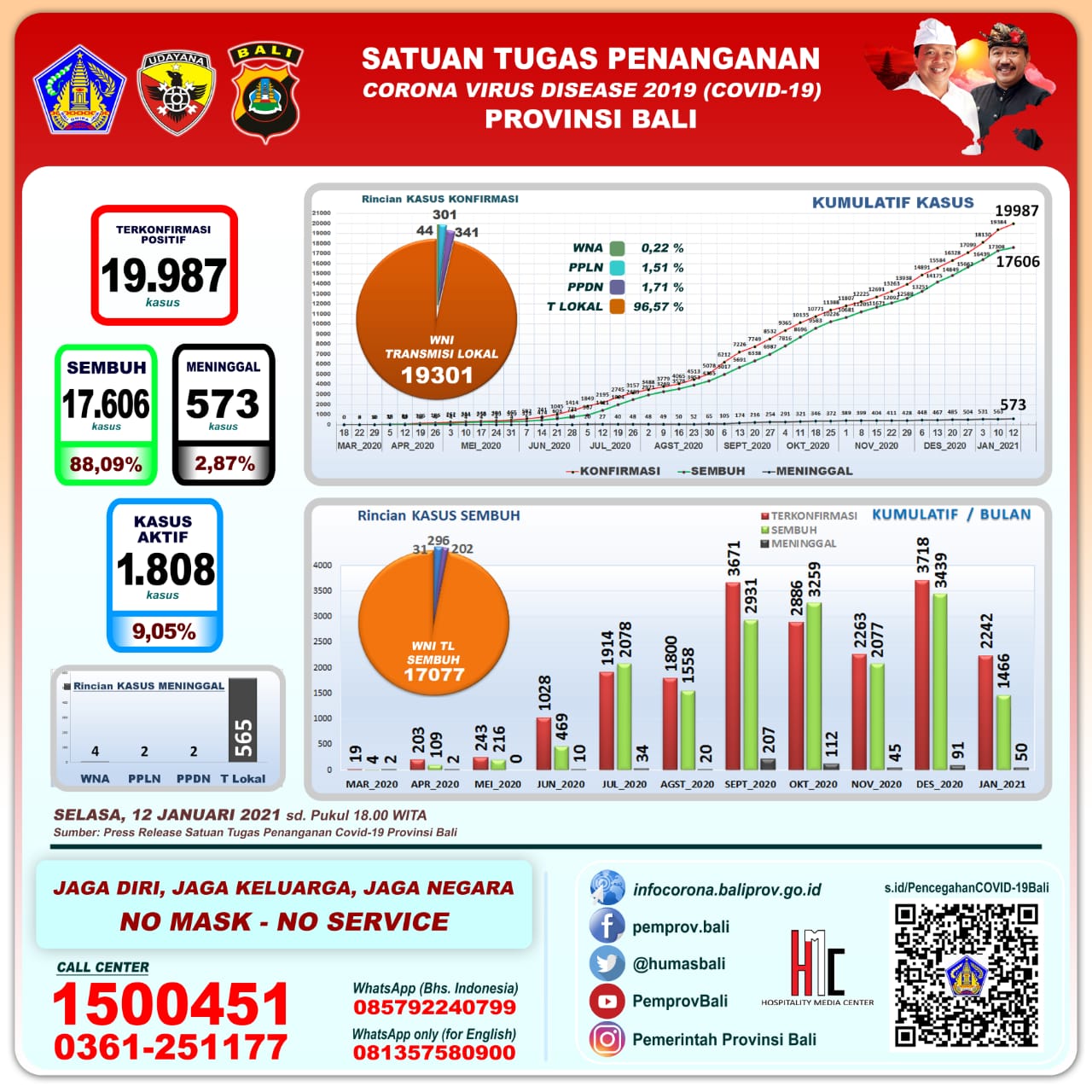 Perkembangan pandemi covid-19 di Provinsi Bali per Selasa (12/1/2021) hari ini mencatat pertambahan kasus terkonfirmasi 350 orang (300 WNI + 2 WNA melalui transmisi lokal, 41 PPDN, dan 5 WNI + 2 WNA tercatat sebagai PPLN), sembuh 136 orang, dan 6 orang meninggal dunia.
