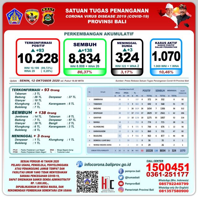 Perkembangan pandemi covid-19 di Provinsi Bali per hari Senin (12/10/2020) ini mencatat pertambahan kasus terkonfirmasi 93 orang melalui transmisi lokal, sembuh 138 orang, dan