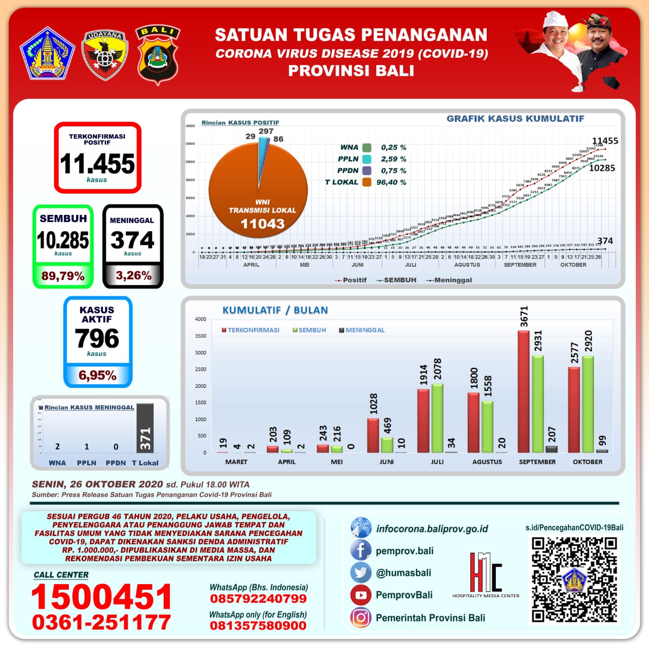 Perkembangan pandemi covid-19 di Provinsi Bali per Senin (26/10/2020) mencatat pertambahan kasus terkonfirmasi 67 orang melalui transmisi lokal, sembuh 59 orang, dan