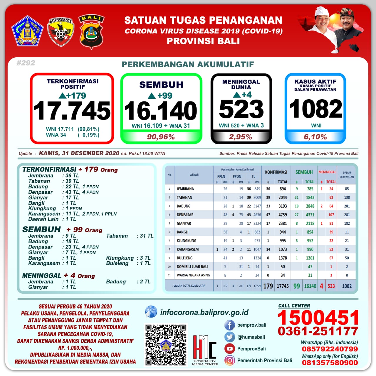 Perkembangan pandemi covid-19 di Provinsi Bali per hari Kamis (31/12/2020) ini mencatat pertambahan kasus terkonfirmasi 179 orang (171 orang melalui transmisi lokal, 1 PPLN dan 7 PPDN), sembuh 99 orang, dan 4 orang meninggal dunia.