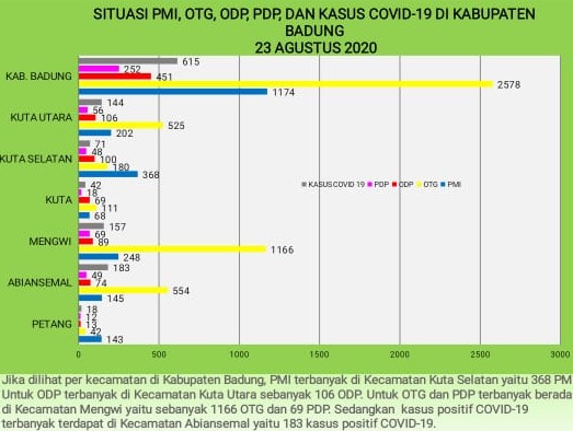 Pada Minggu (23/8/2020), ada penambahan 10 kasus positif sehingga total kasus positif covid-19 di Badung kini menjadi 615 orang (134 PDP, 51 ODP, 414 OTG, 16 PMI). Hal ini dikemukakan Koordinator Kehumasan Gugus Tugas Percepatan Penanganan Covid-19 Badung GN Jaya Saputra.