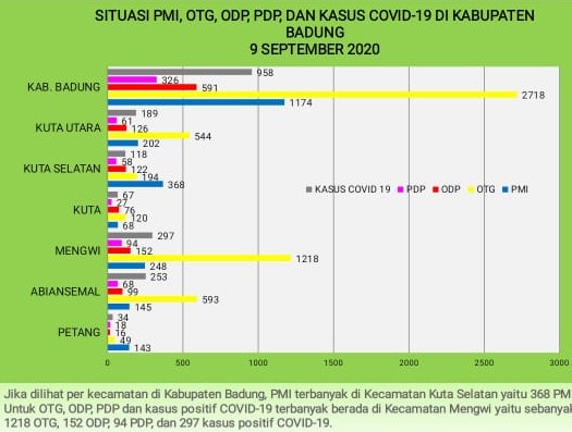 Penambahan 37 kasus positif yaitu 9 PDP (dari Pelaga, 2 Abiansemal, Gulingan, Sading, Kedonganan, Tuban, Pecatu dan Kutuh), 17 ODP (dari Mekar Bhuwana, Sedang, Abianbase, 2 Kuwum, 5 Mengwi, Mengwitani, 2 Penarungan, 2 Tumbak Bayuh, Jimbaran dan Dalung) dan 11 OTG (dari Mambal, Dauh Yeh Cani, Sibang Kaja, Sading, Baha, Kuwum, Seminyak, Benoa, Jimbaran, Dalung dan Canggu).