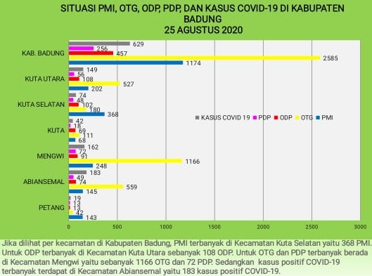 Penambahan 7 kasus positif yaitu 2 PDP (dari Pangsan dan Kapal), 2 ODP (dari Kerobokan Kaja dan Kapal) dan 3 OTG (dari Kerobokan Kelod dan 2 Dalung). Dari jumlah kasus positif tersebut, 81 masih dalam perawatan dan 536 sembuh (tambahan 4 sembuh yaitu dari Sembung, Selat, Pecatu dan Canggu).
