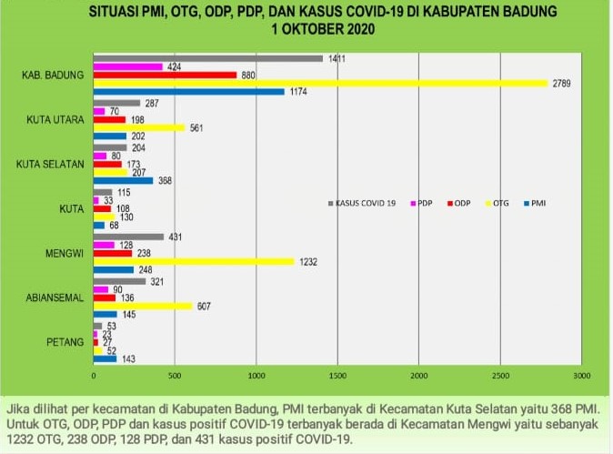 Penambahan kasus positif hari ini terdiri atas 4 PDP (dari Benoa, Abianbase, Kutuh dan Kapal), 10 ODP (dari Kutuh, Kerobokan Kaja, Jimbaran 2 orang, Seminyak, Kuta, Tuban, Buduk 2 orang, Sibang Kaja) dan 12 OTG (dari Benoa 2 orang, Jimbaran 6 orang, Kapal, Kuta, Mengwitani dan Seminyak). Dari total kumulatif kasus positif Covid-19 sampai hari ini, 442 masih dalam perawatan dan 934 sembuh (tambahan 17 sembuh yaitu dari Abiansemal, Angantaka 2 orang, Dalung, Jagapati, Jimbaran, Kerobokan, Kuta, Mekar Bhuwana, Mengwitani, Pangsan 4 orang, Sedang, Pecatu dan Tuban).