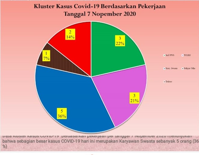 Pada Sabtu (7/11/2020), ada tambahan 14 kasus positif/konfirmasi sehingga total kumulatif kasus positif/konfirmasi Covid-19 di Kabupaten Badung kini menjadi 2.112 orang. Hal tersebut diungkapkan Koordinator Kehumasan Percepatan Penanganan Covid-19 Badung GN Jaya Saputra.
