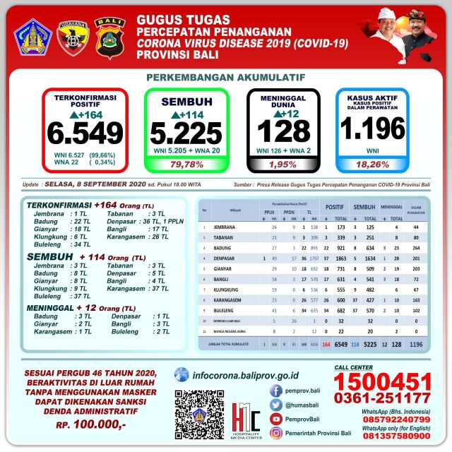 Perkembangan pandemi covid 19 di Provinsi Bali per hari Selasa (8/9/2020) mencatat pertambahan kasus terkonfirmasi sebanyak 164 orang terdiri atas 163 transmisi lokal dan 1 PPLN, kasus sembuh 114 orang, dan 12 pasien terkonfirmasi meninggal dunia.