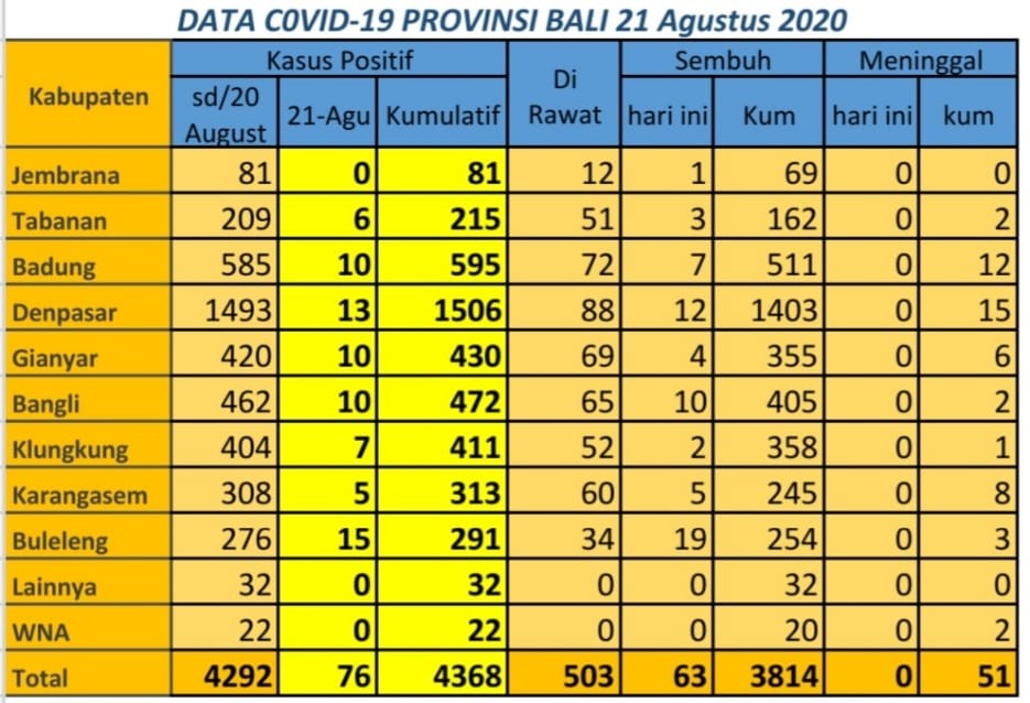 Gugus Tugas Percepatan Penanganan Covid-19 Provinsi Bali menyampaikan perkembangan penanganan corona virus disease (covid-19) di Provinsi Bali per Jumat (21/8/2020). Jumlah kumulatif pasien positif 4.368 (bertambah 76 orang).