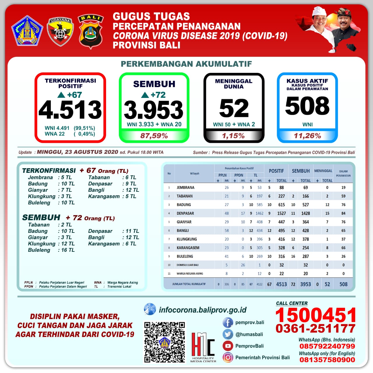 Secara kumulatif, kasus terkonfirmasi positif menjadi 4.513 orang, sembuh 3.953 orang (87,59%), dan meninggal dunia 52 orang (1,15%).