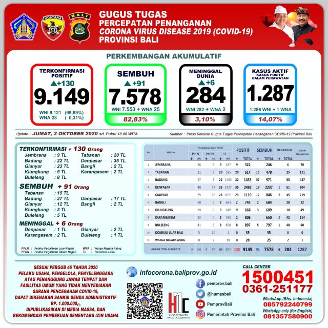 Perkembangan pandemi covid-19 di Provinsi Bali per hari Jumat (2/10/2020) mencatat pertambahan kasus terkonfirmasi 130 orang melalui transmisi lokal, sembuh 91 orang, dan
