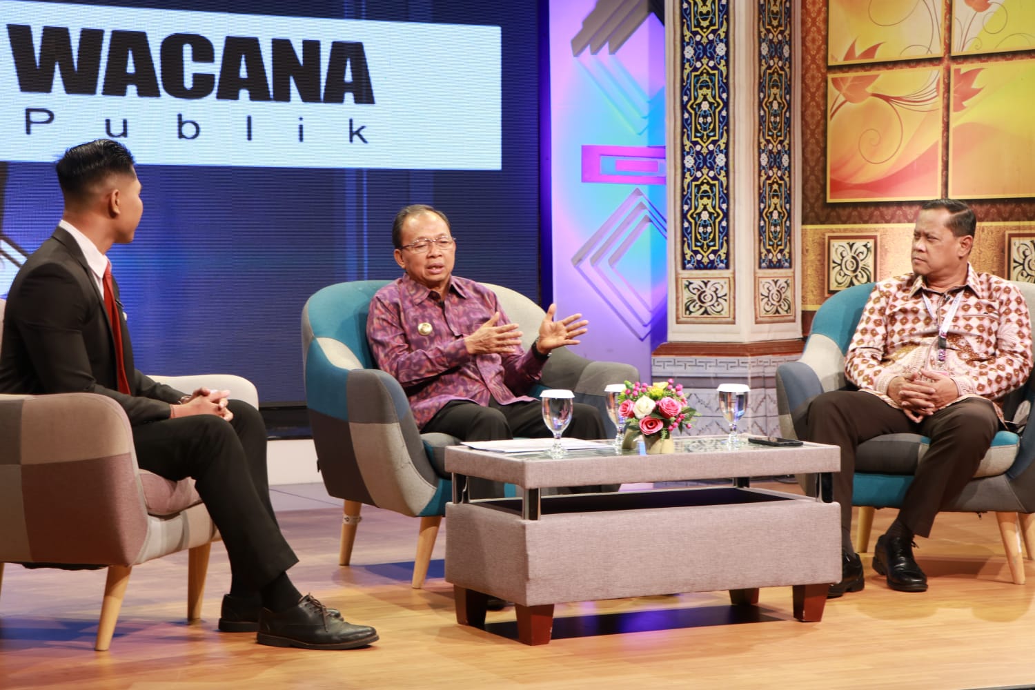 Gubernur Bali Wayan Koster menjadi narasumber pada Dialog Wacana Publik yang disiarkan langsung TVRI Bali, Rabu (Budha Pon Wuku Pujut), (6/7/2022). Dialog yang mengusung tema “Peran Serta Masyarakat dalam Pemberantasan Korupsi” juga menghadirkan Deputi Pendidikan dan Peran Serta Masyarakat KPK RI Wawan Wardiana.