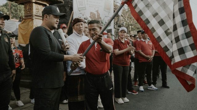 JALAN SEHAT – Wakil Bupati Badung, Bagus Alit Sucipta membuka kegiatan jalan sehat bersama di Desa Adat Sading, Mengwi, Minggu (24/8).