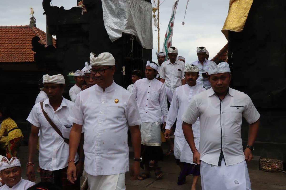 KARYA – Wabup Ketut Suiasa saat menghadiri Karya Alit, Melaspas dan Mendem Pedagingan di Pura Desa, Desa Adat Semanik, Kecamatan Petang, Senin (13/5).