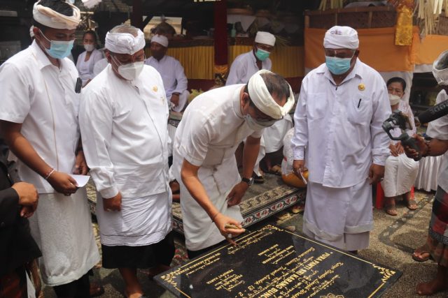 Dalam acara tersebut Wabup Suiasa melakukan penandatanganan Prasasti Kebo Iwa dan menyerahkan punia secara simbolis Rp 225 juta yang diterima langsung oleh Pawartaka Karya Jro Mangku Sudiana Karang.