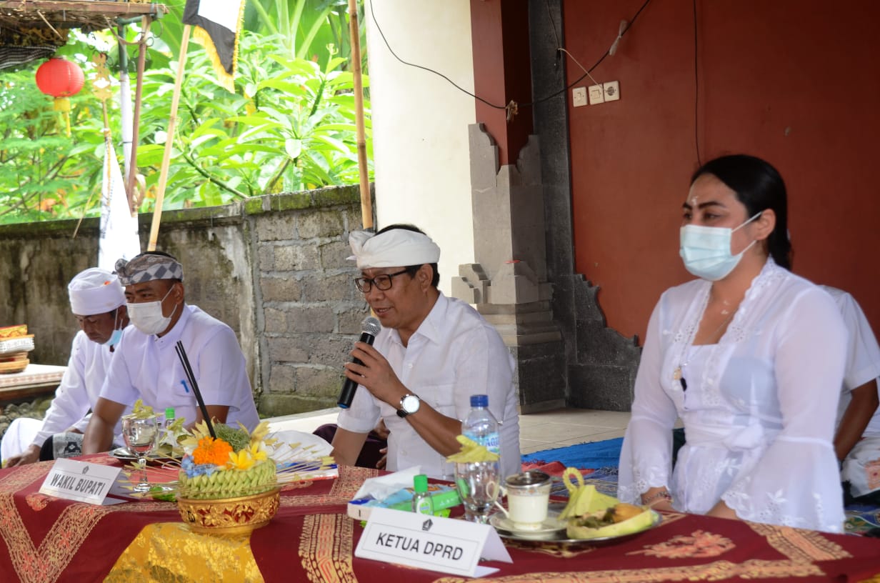 Wakil Bupati Badung I Ketut Suiasa didampingi anggota DPRD Badung Komang Triani menghadiri rangkaian Karya Ngodak Tapakan Ratu Gede Landung, Pura Dalem Tungkub, Br. Sila Dharma, Desa Mengwitani, Kecamatan Mengwi, Selasa (12/1). Guna mendukung karya tersebut, Wabup Suiasa menyerahkan dana aci Rp 225 juta. Pelaksanaan upacara tetap mematuhi protokol kesehatan covid-19. Acara tersebut juga dihadiri Camat Mengwi, I Nyoman Suhartana, Perbekel Mengwitani Putu Sumardita, Bendesa Mengwitani Putu Wendra, serta Kalian Dinas dan Adat Banjar Sila Dharma.