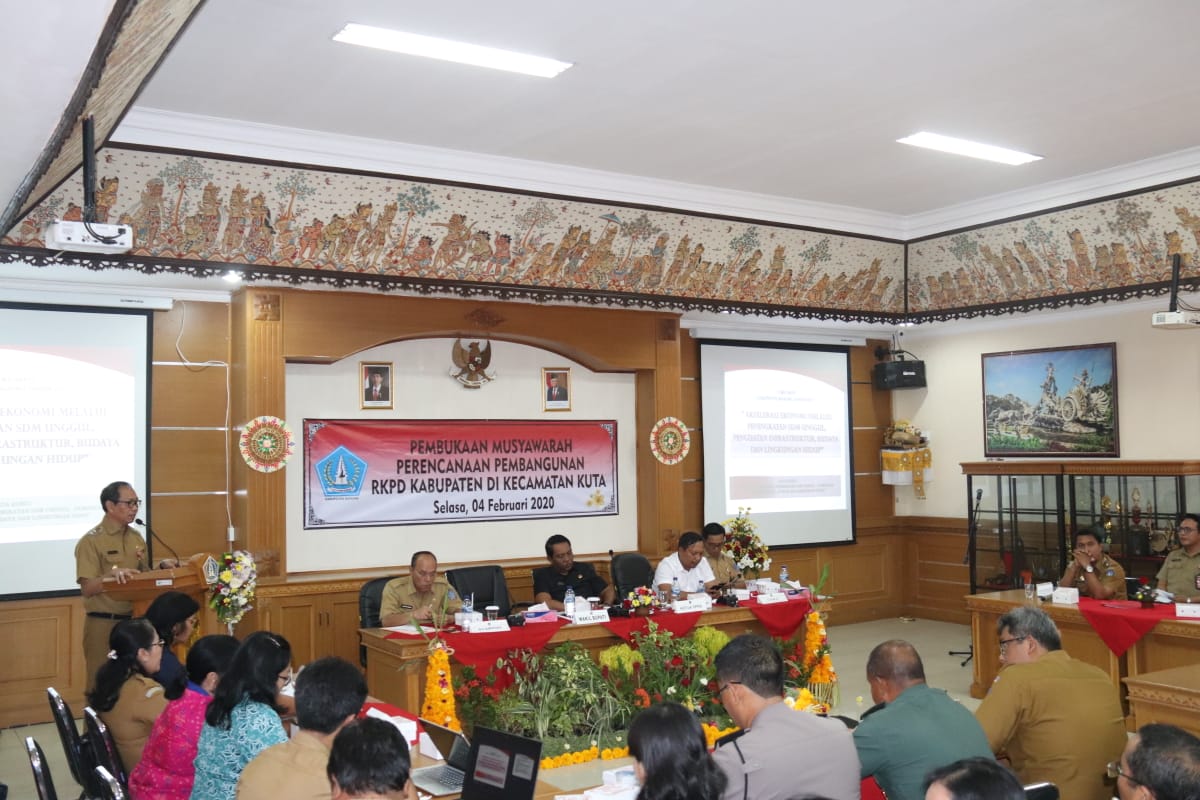 Wakil Bupati Badung I Ketut Suiasa menghadiri pelaksanaan Musrenbang di Kecamatan Kuta yang dibuka Kepala Bappeda Badung I Made Wira Dharmajaya di Kantor Camat Kuta, Selasa (4/2) kemarin. Turut hadir Ketua DPRD Badung diwakili IG Anom Gumanti, Anggota DPRD I Nyoman Graha Wicaksana, Wakil Ketua TP PKK Kabupaten Badung Ny. Kristiani Suiasa beserta organisasi kewanitaan lainnya, Camat Kuta I Nyoman Rudiarta beserta Tripika, Kepala Badan Statistik Badung Ni Putu Minarni, Kepala OPD di lingkungan Pemkab Badung, Lurah dan tokoh masyarakat se-Kecamatan Kuta. Adapun tema RKPD Kabupaten Badung tahun 2021 yaitu “Akselerasi Ekonomi Melalui Peningkatan SDM Unggul, Penguatan Infrastruktur, Budaya dan Lingkungan Hidup”.