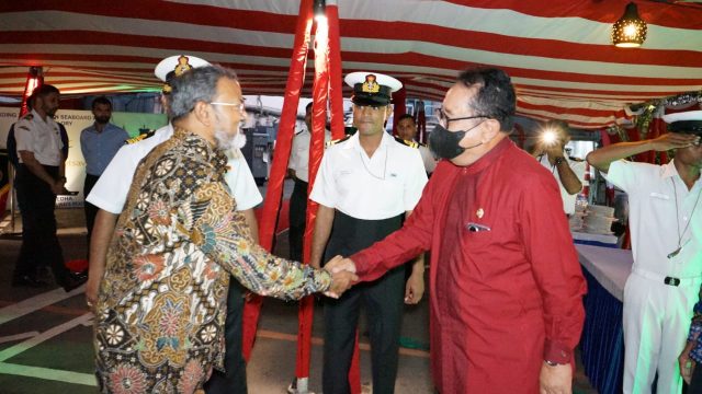 Wakil Gubernur Bali Prof. Tjokorda Oka Artha Ardhana Sukawati (Cok. Ace) menghadiri acara jamuan makan malam di atas geladak kapal perang India INS Sumedha yang tengah bersandar di Dermaga Timur Pelabuhan Benoa, Jumat, Sukra Pon Tambir, (5/8/2022).