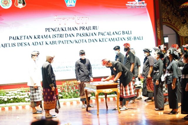Pada acara yang turut dihadiri oleh Wakapolda Bali Brigjen Pol. Drs. I Ketut Suardana, jajaran Forum Koordinasi Pimpinan Daerah Bali, Bandesa Madya MDA Kabupaten/Kota se-Bali, Bandesa Alitan MDA Kecamatan se-Bali, para pengurus Paiketan Krama Istri MDA Provinsi Bali, Kabupaten/Kota se-Bali Pengurus Pasikian Pacalang Bali MDA Provinsi Bali dan Kabupaten/Kota dan Kecamatan se-Bali, para pengurus Pasikian Yowana Bali MDA Provinsi Bali, kepala dinas terkait di lingkungan Pemprov Bali baik yang hadir secara offline dan online, dilaksanakan pengukuhan Prajuru Paiketan Krama Istri dan Pasikian Pacalang Majelis Desa Adat Kabupaten/Kota se Bali dan penandatanganan berita acara pengukuhan oleh Bendesa Agung dan Kepala Dinas Pemajuan Masyarakat Adat Provinsi Bali. (sar/hmbal)