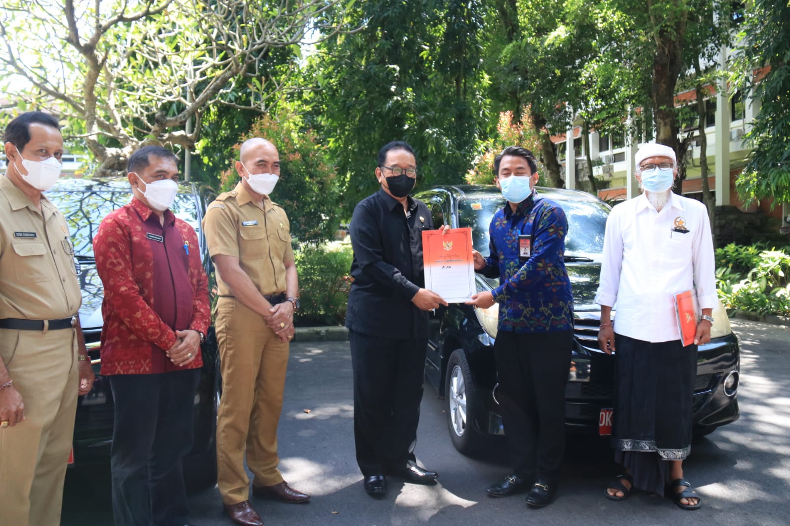 KENDARAAN – Wagub Cok. Ace serahkan bantuan kendaraan operasional kepada FKUB dan KPA, Senin (11/4/2022).