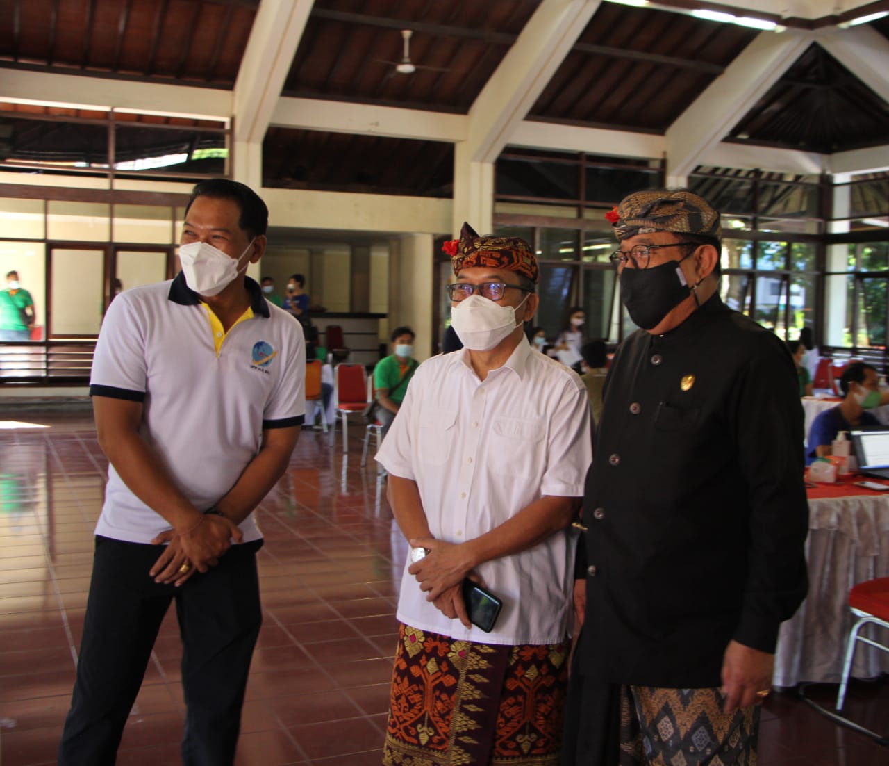 Didampingi Kepala Perwakilan BI Provinsi Bali Trisno Nugroho, Wagub Cok. Ace menyapa beberapa peserta vaksinasi covid-19. Vaksinasi kali ini menyasar 600 pekerja di bidang logistik dan forwarder.