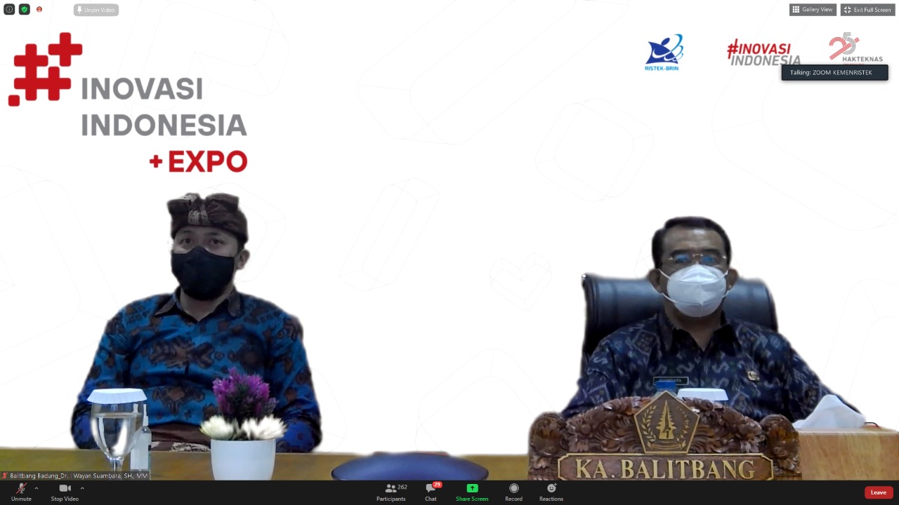 INOVASI – Kepala Balitbang Kabupaten Badung I Wayan Suambara didampingi Anak Agung Gede Agung Rahma Putra saat mengikuti Pembukaan Inovasi Indonesia Expo 2020, Selasa (10/11/2020).