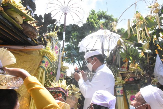 Upacara yang diiiringi dengan Tari Sakral Rejang Dewa dan pementasan topeng dihadiri juga oleh Camat Denpasar Utara, Nyoman Lodra, Perbekel Desa Ubung Kaja, Wayan Astika, tokoh adat serta warga banjar setempat. Upacara tersebut juga telah menerapkan protokol kesehatan yang ketat seperti menjaga jarak, mencuci tangan dan memakai masker.