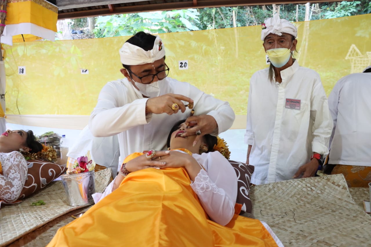 Wali Kota Denpasar I Gusti Ngurah Jaya Negara ngayah nyangging rangkaian Upacara Atma Wedana Desa Adat Kesiman Kecamatan Denpasar Timur, Sabtu (20/8) di Pura Dalem Mutering Jagat Kesiman. Tampak prosesi mepandes atau potong gigi diikuti 609 orang yang sudah sejak pagi mengikuti satu per satu rangkaian upacara.