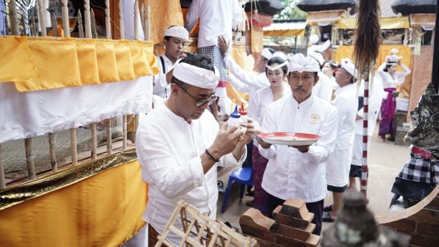 MELASPAS – Walikota Denpasar I Gusti Ngurah Jaya Negara menghadiri Upacara Melaspas lan Mendem Pedagingan di Pura Puseh Dadia, Desa Adat Penatih bertepatan dengan Saniscara Paing Merakih, Sabtu (20/4).