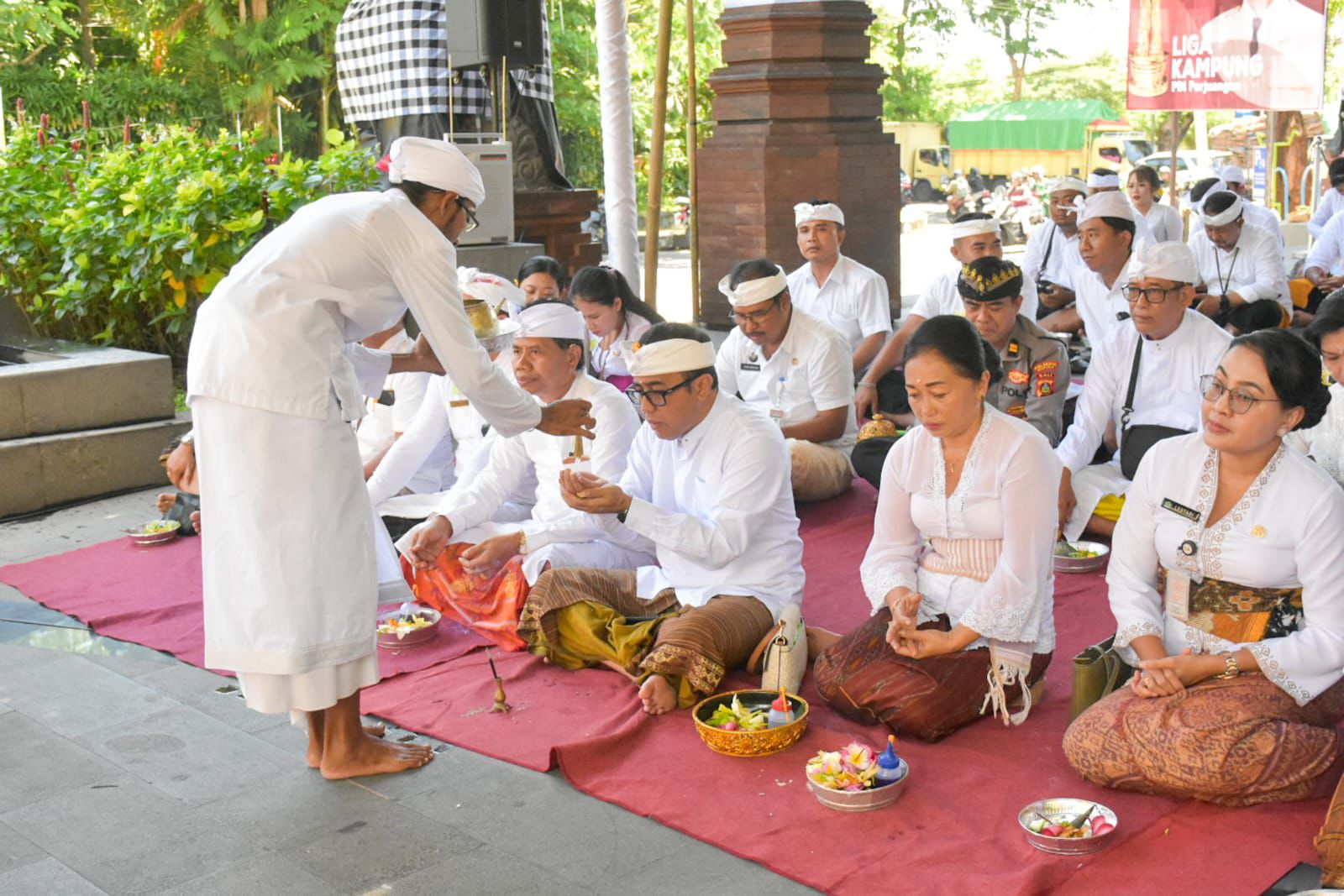 Walikota Denpasar I Gusti Ngurah Jaya Negara bersama Ketua TP PKK Kota Denpasar Ny. Sagung Antari Jaya Negara menghadiri Karya Pemelaspas, Ngenteg Linggih, Padudusan Alit, Mupuk Pedagingan, Mecaru Rsi Gana dan Mecaru Wraspati Kalpa di Parahyangan Padmasana Gedung Dharma Negara Alaya (DNA) Kota Denpasar bertepatan dengan Purnama Sasih Kaenem, Kamis (4/12). Upacara tersebut dilaksanakan sebagai upaya melengkapi upacara serta mewujudkan keseimbangan berlandaskan Tri Hita Karana.