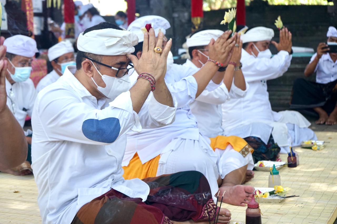 Wali Kota Denpasar, IGN Jaya Negara melaksanakan persembahyangan pujawali di Pura Taman Sari, Desa Dangin Puri Kangin, Kecamatan Denpasar Utara yang jatuh setiap Purnama Jhiesta, Senin (26/4).