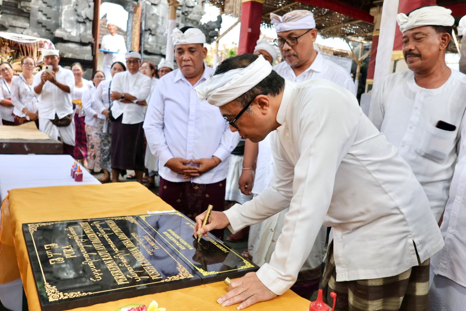 TEKEN PRASASTI – Walikota Denpasar I Gusti Ngurah Jaya Negara meneken prasasti Pura Pererepan Ratu Ayu Dalem Penatih, Puseh Kanginan, Desa Adat Pedungan, Senin (12/5/2025).