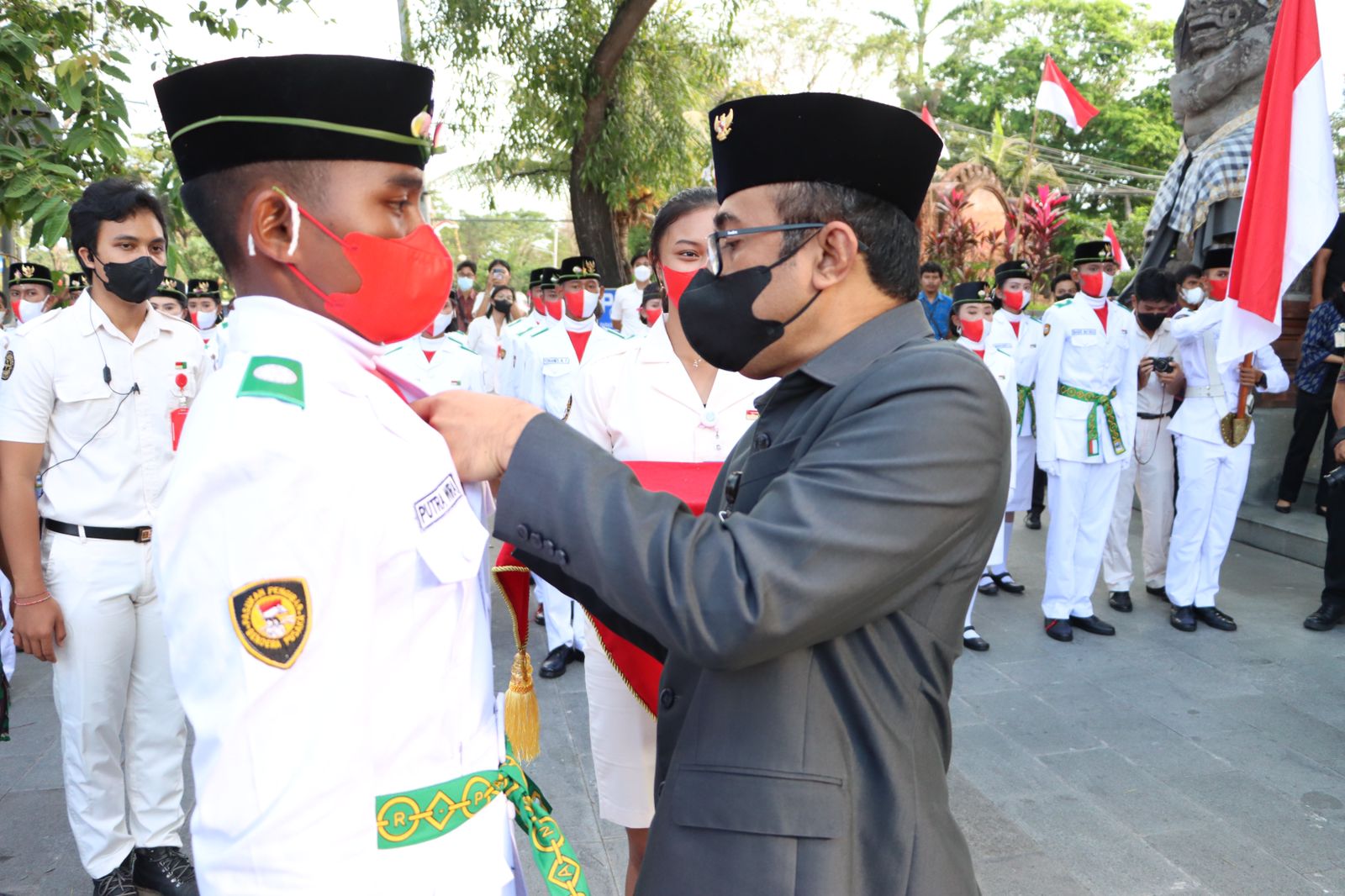 Walikota Denpasar, I Gusti Ngurah Jaya Negara mengukuhkan Pasukan Pengibar Bendera Pusaka (Paskibraka) Kota Denpasar di halaman depan Gedung Dharma Negara Alaya Denpasar, Sabtu (13/8). Sebanyak 78 orang dikukuhkan menjadi Paskibraka Kota Denpasar yang ditandai dengan pemasangan Kendit atau Sabuk berwarna hijau kepada perwakilan Paskibraka Kota Denpasar.