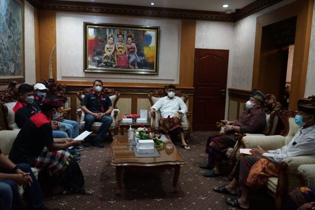 AUDIENSI – Ketua Askot PSSI Denpasar AA Ngurah Candra Gupta saat beraudiensi dengan Walikota Denpasar, Kamis (30/9/2021).
