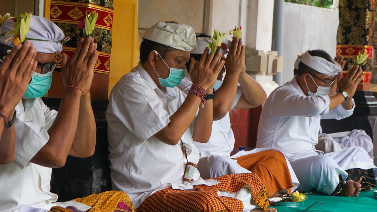“Rangkaian upacara sudah dilaksanakan sejak pukul 06.00 wita dan untuk penyineban akan dilaksanakan sore hari. Untuk menerapkan protokol kesehatan, persembahyangan dilaksanakan bergiliran dengan menyediakan sarana protokol kesehatan lainya,” jelasnya