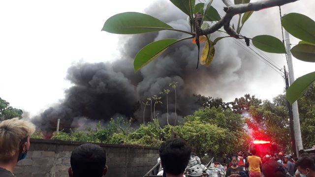 BERHAMBURAN – Warga berhamburan keluar rumah ketika gudang rongsokan di bilangan Renon terbakar hebat.