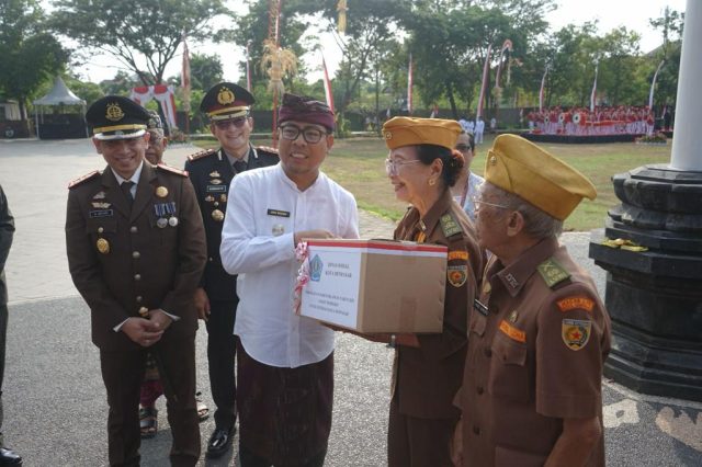APEL HARI PAHLAWAN – Wakil Walikota Denpasar I Kadek Agus Arya Wibawa memimpin apel peringatan Hari Pahlawan dan menyerahkan bantuan sembako secara simbolis kepada para veteran, Jumat (10/11).