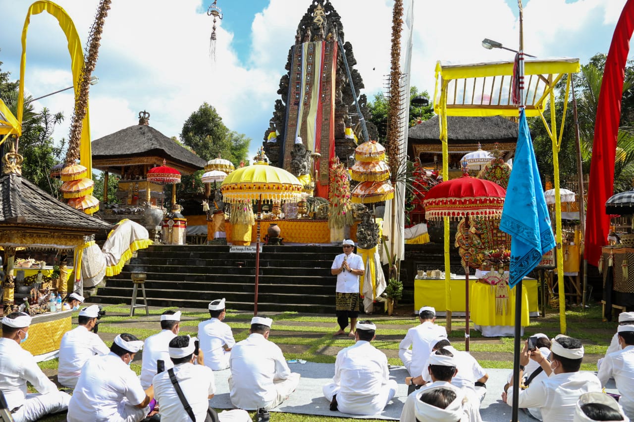 PENGANYARAN – Bupati Giri Prasta saat menghadiri bhakti Penganyaran Pemkab Badung serangkaian Karya Pujawali tahun 2021 di Pura Mandara Giri Semeru Agung, Lumajang Jawa Timur, Selasa (29/6).
