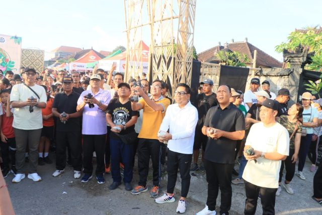 LEPAS BURUNG – Wawali Denpasar I Kadek Agus Arya Wibawa, melepas burung merpati sebagai tanda dimulainya jalan santai Peguyangan Festival (Yang Fest) 2025, Minggu (19/10) di Lapangan Antasura, Banjar Benaya, Kelurahan Peguyangan.